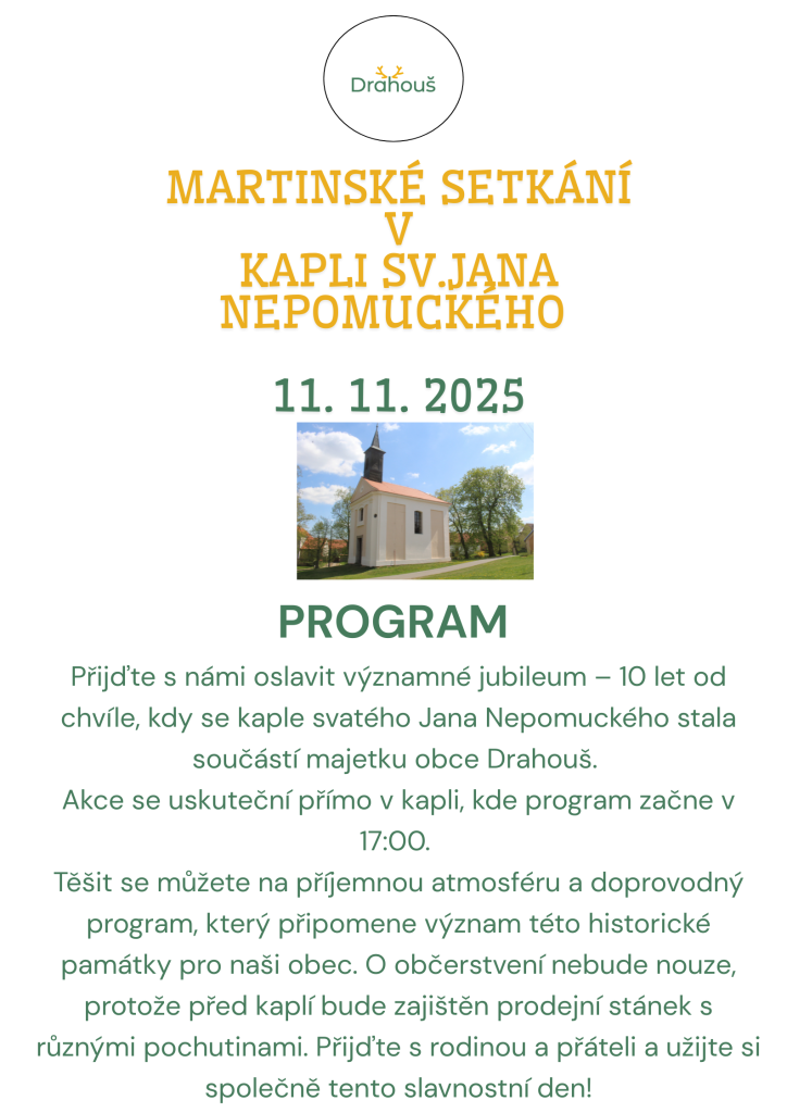 Přijďte oslavit 10 let od začlenění kaple svatého Jana Nepomuckého do majetku obce Drahouš. Akce se koná 11. listopadu 2025 od 17:00 přímo v kapli. Těšit se můžete na příjemnou atmosféru a doprovodný program, který nám připomene význam této historické památky pro naši obec. Pro návštěvníky bude k dispozici prodejní stánek s občerstvením, takže si užijete nejen program, ale i dobré jídlo a pití. Srdečně zveme všechny rodiny a přátele, abyste s námi strávili tento slavnostní den.